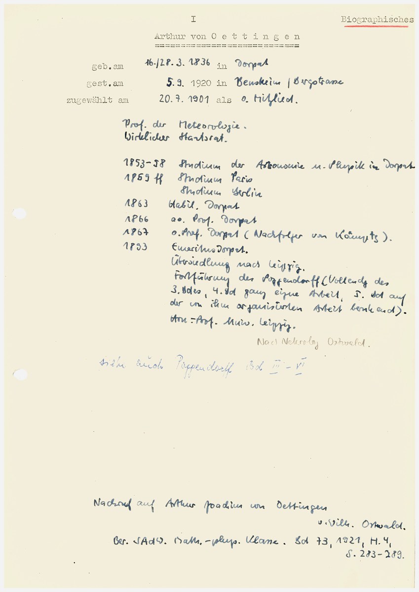 Mitgliederakte SAW (Oettingen, A. von)