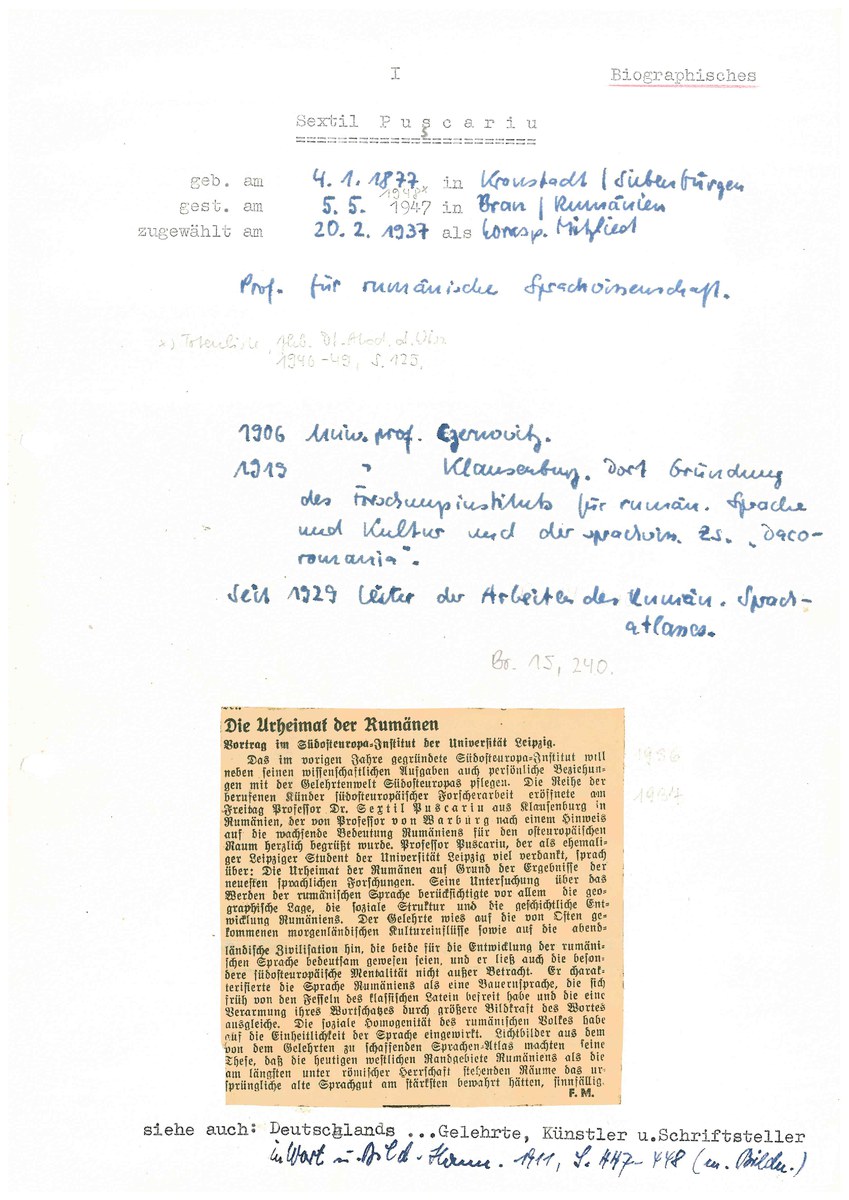 Archiv der Sächsischen Akademie der Wissenschaften zu Leipzig, Pușcariu, Sextil: Mitgliederakte SAW (Pușcariu, S.), S. 1