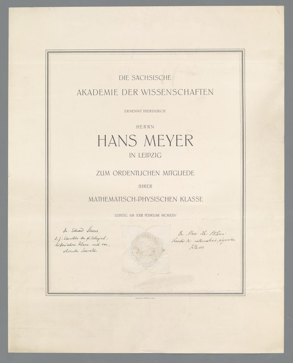 Ernennungsurkunde als ordentliches Mitglied der Sächsischen Akademie der Wissenschaften (Hans Meyer)